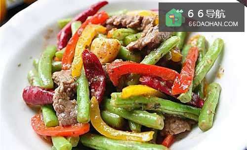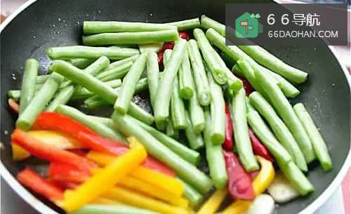 3再加1大匙油,将四季豆、彩椒下锅拌炒,然后加入少许的水,盖上锅盖让其约闷煮熟。