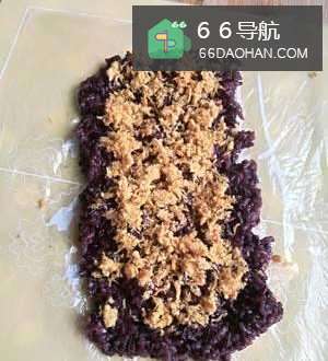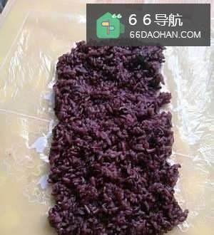 4铺层保鲜膜后,放上米饭摊成小长方形压实。