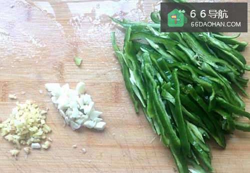 3青椒去蒂和白色的筋,洗净切成细丝,大蒜、生姜切成碎末