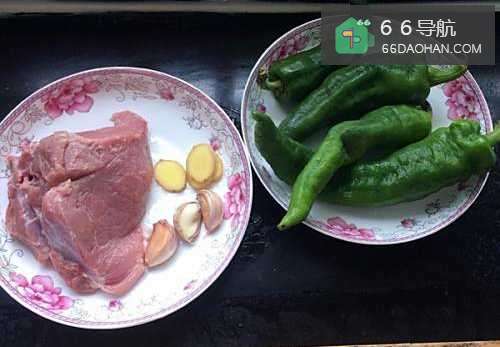 首先准备好食材,猪瘦肉300g,青椒5个,生姜3小片,大蒜3瓣