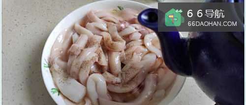 2用开水将鱿鱼焯水2分钟断生后装盘。