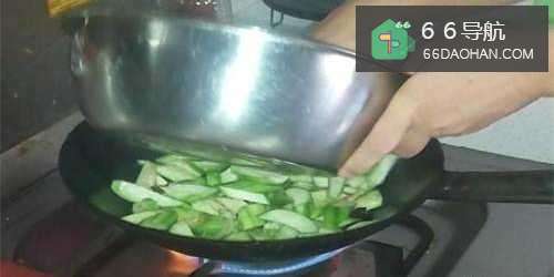 3加入葱和蒜,倒入备用的丝瓜块(水倒净),不断翻炒。