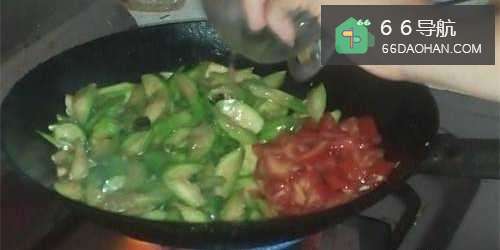 4丝瓜炒熟后,倒入备用的番茄,翻炒几下。