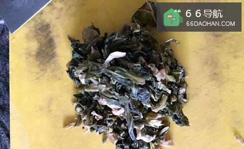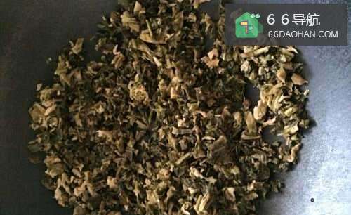 4把切碎的菜干下锅炒干水分,捞出备用。
