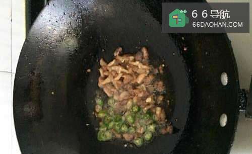 5热锅下油,加猪肉翻炒,闷五六分钟。