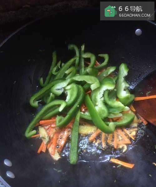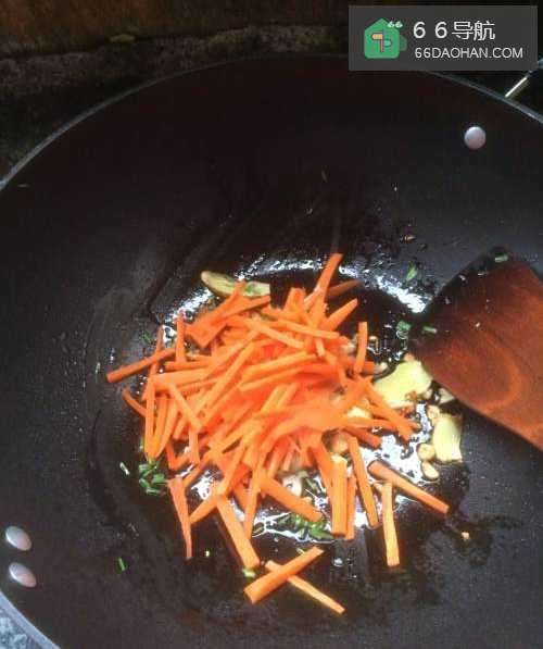 5将胡萝卜丝下入锅里,翻炒至熟;通常翻搅几分钟,胡萝卜就会颜色由偏红变偏黄,就熟了;