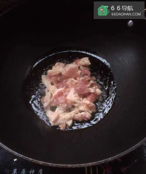 3将五花肉清洗干净,切成小块;开火,加入适量的食用油,将五花肉先煎好盛出;