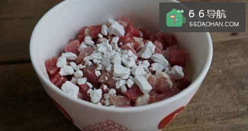 2瘦肉切成小丁,放入少许红薯淀粉,盐,胡椒粉,腌制上浆