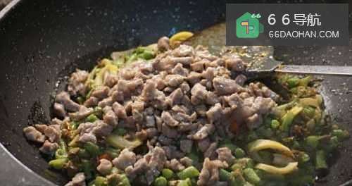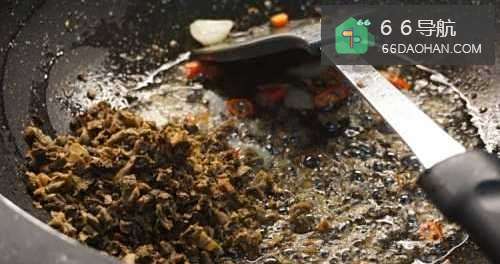 7然后倒入放入切碎的自制芽菜末继续炒香