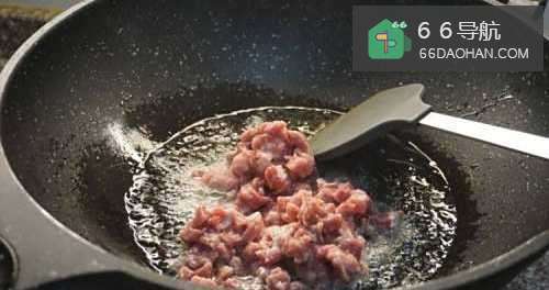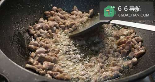 4锅里放入少许油,油温6成热的时候倒入腌制后的肉丁滑散