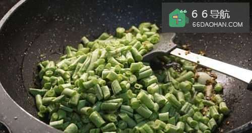8倒入切成段的四季豆,干煸到四季豆起皱