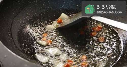 6锅里留底油,放入小米辣椒段,蒜片爆锅炒香