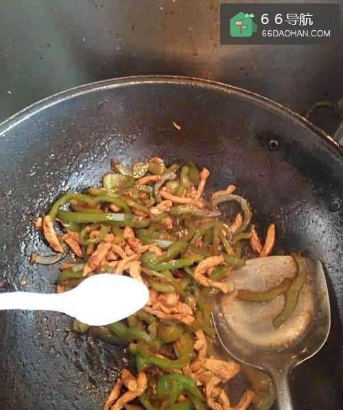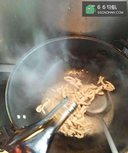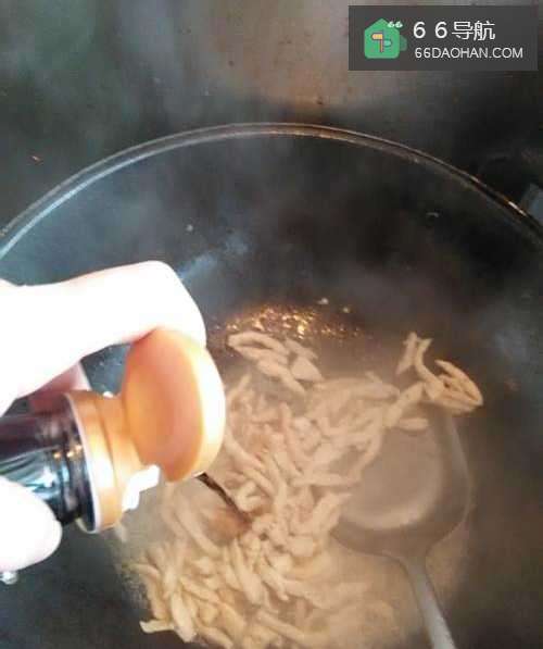 4鸡丝炒至发注游科白后,倒入适量的料酒去腥、增加香味。