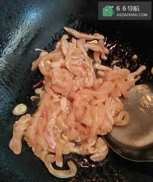 3将葱和姜炝出香味后,放入鸡丝煸炒。