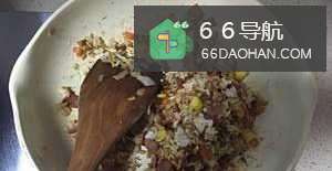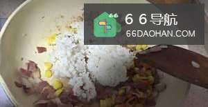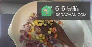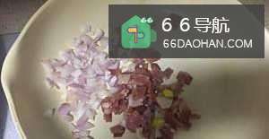 3锅内倒入少许油,放入洋葱和培根,炒出香味。