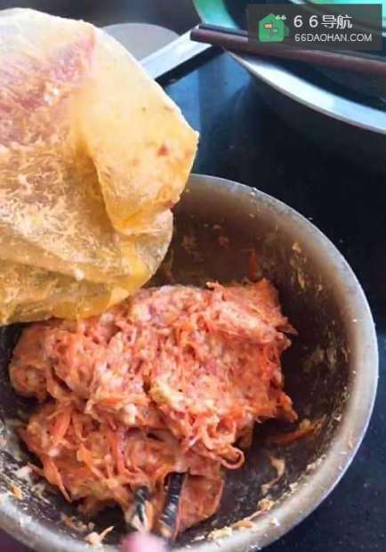 2将肉末和胡萝卜丝放在一个盆中,撒入适量盐、胡椒粉、花椒粉搅拌调味。