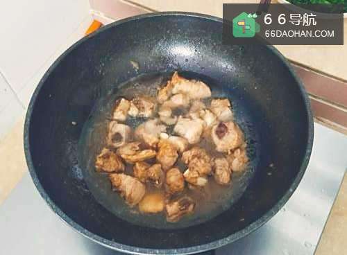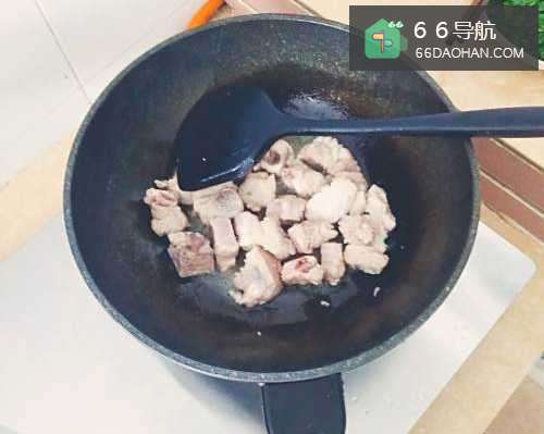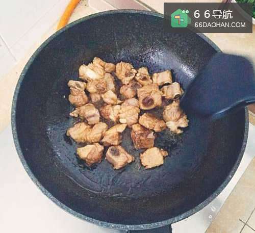 排骨焯水,重新热锅下油,排骨下锅煎;