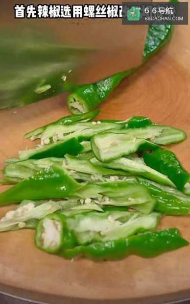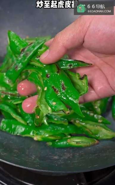 3锅中不要放油烧热,加入切好的辣椒再放一点盐,开小火一边炒一边用勺子压出它的香味,炒至起虎皮状出锅备用。