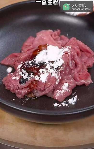 2把切好片的前腿肉放入碗中加入盐、蚝油、老抽、一点生粉,然后用手抓拌均匀腌制2分钟。
