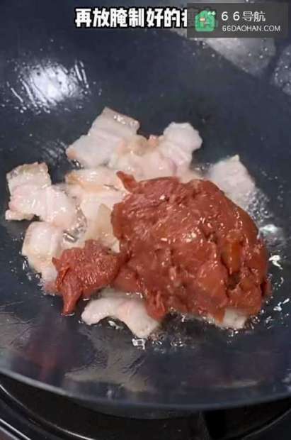 4锅中烧油,放入切好的五花肉炒出多余的油脂,再放入腌制好的前腿瘦肉和大蒜,开大火炒出香味,把肉炒熟,最后再放入辣椒,翻炒均匀就可以出锅了。