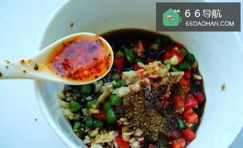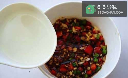 4制作调味汁把葱姜蒜末、小米椒、盐、醋、生抽、花椒粉、辣椒油混合搅拌均匀