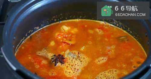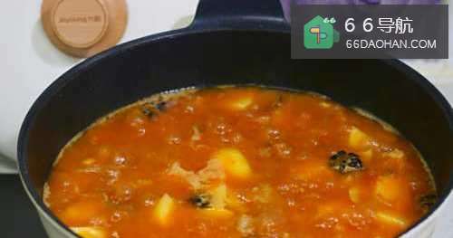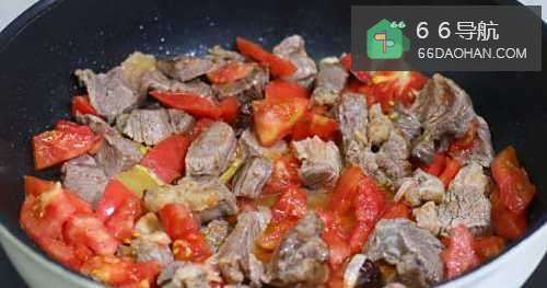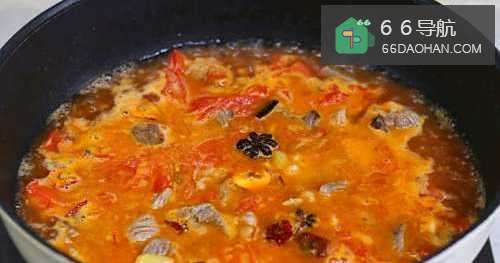 7然后把压好的牛肉连汤一起倒回炒锅,土豆去皮切成滚刀块儿,放进锅中,烧至土豆绵软即可关火。