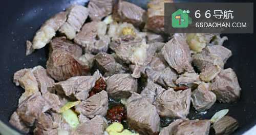 3西红柿洗净切块儿,葱姜改刀;热锅凉油,下八角和桂皮炸香,然后再放葱姜炒出香味儿,再放牛肉进去翻炒几分钟。