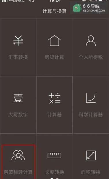 3点击功能扩展按钮之后,我们会打开一个“计算与换算”的新界面,在新的界面里我们找到“亲戚称呼计算”功能。
