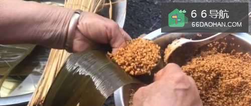 4、包的时候放一块五花肉和一个咸蛋黄剩余放糯米。