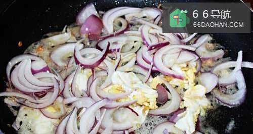 4鸡蛋炒好后,放入洋葱翻炒至断生。