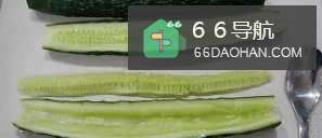 2黄瓜切掉两头.对半切开,用不锈钢勺或小刀把中间的瓤去掉这一步不要省略,不去掉瓤就没有脆脆的口感了.