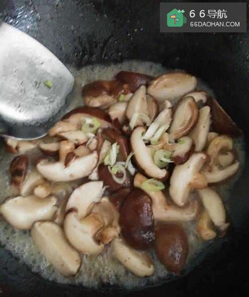 4油热后,先下香菇,因为香菇喜油,遇油香味会散发出来。