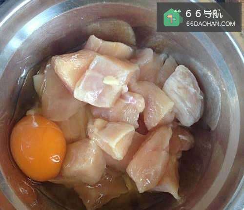 2将鸡胸肉洗净切成2cm左右大小的小鸡块,然后再打一个鸡蛋进去,加入半茶匙的胡椒粉以及适量的生抽,然后拌匀腌渍半小时左右。