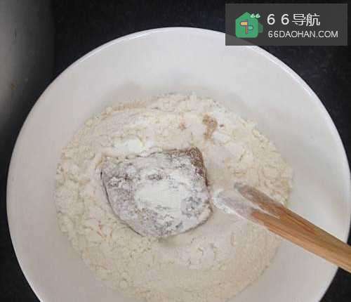 4再拿出另一个碗里,装上适量的面粉,将裹好炸鸡粉的鸡肉块再放进面粉里裹一层面。