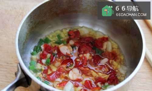 8另起一小锅将油烧热,加入葱、姜、蒜和泡椒。