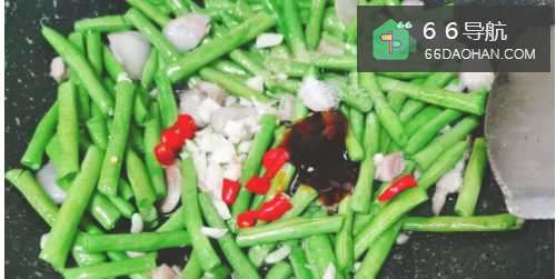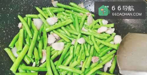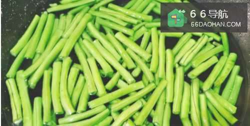 5接着把焯好水的豇豆放入锅翻炒片刻。
