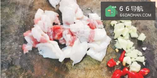 3把猪肉洗干净切成片,把大蒜籽切碎,小米辣切成段