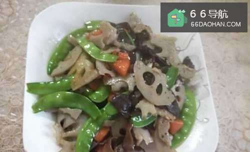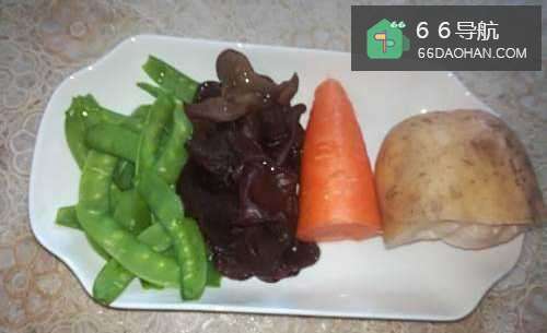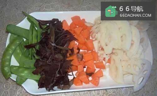 2黑木耳泡发后切成条,将藕刮去表皮切成片,胡萝卜切成丁,切片也行,荷兰豆撕去两端老筋备用。