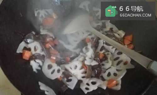 5胡萝卜、黑木耳翻炒一分钟后,加入藕片、荷兰豆继续快速翻炒1分钟