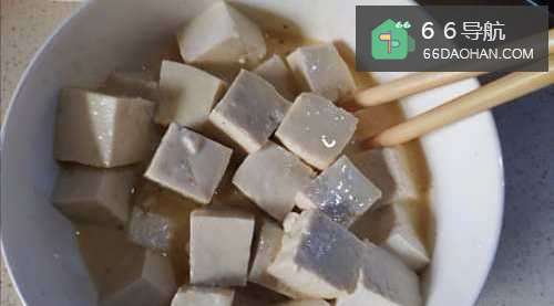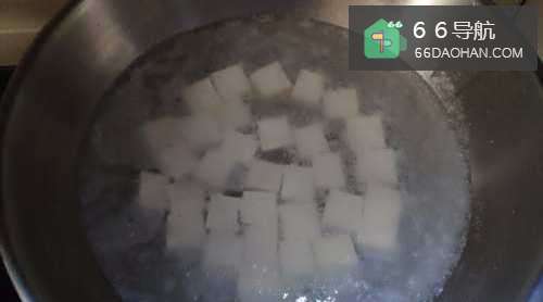 2锅里倒入适量水,加入适量盐,大火烧开八彩后把豆腐放进去焯水