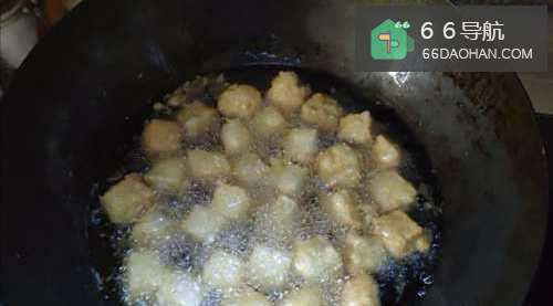 6将豆腐块捞出后,开大火继续将油温加热到7成热,把豆腐块倒进去复炸30秒,捞出控油