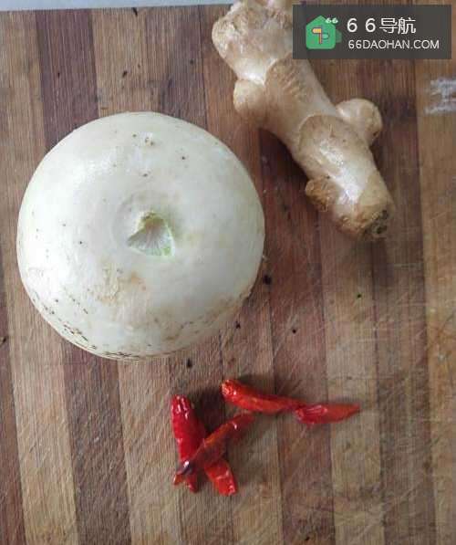 如图,首先将白萝卜、生姜、大葱、干红椒洗净,然后切好备用。