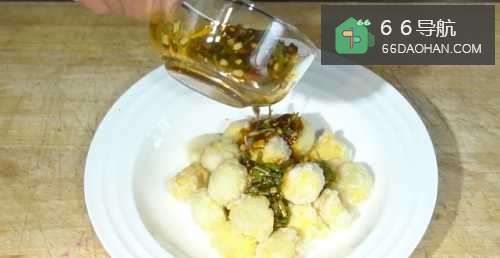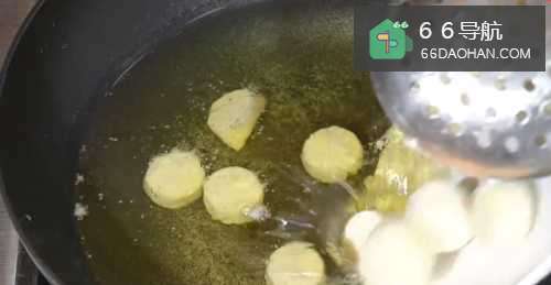 33、日本豆腐放入蛋液中,裹上薄薄的一层,入锅炸至金黄色。