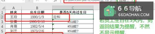 2选中C2单元格,然后输入公式“=IF(DATEDIF(B25,TODAY(),"YD")<=5,"提醒",“”)”