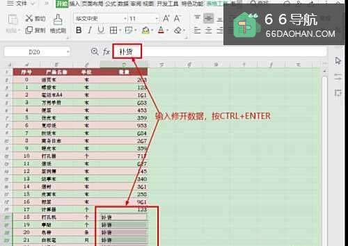 5在公式栏输入【补货】,然后按【CTRL+ENTER】键即可实现批量修改。