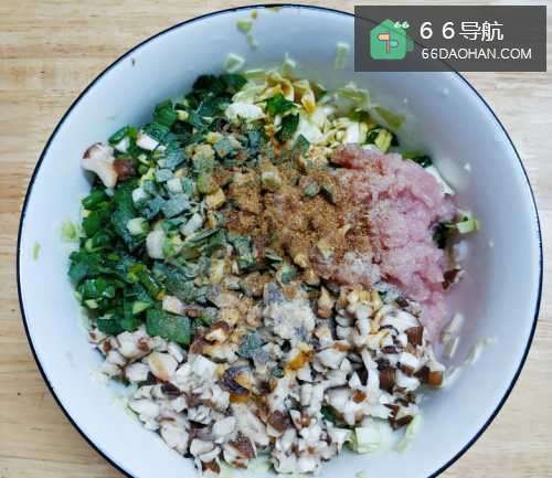 3把包菜、香菇、葱姜蒜的水分倒掉后,全部食材倒入一个大碗中,再加入适量的食用油、五香粉、酱油后搅拌均匀。