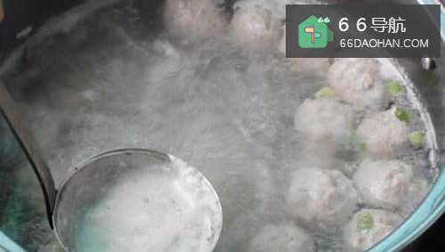 6然后放入水中,待最后一个丸子挤完后,用勺子撇去锅中的浮沫;