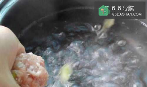 5锅中倒入清水,放入姜片,大火烧开后,将手上涂一点水,将肉馅放入手掌心,握成拳,让肉馅从虎口挤出,形成丸子;