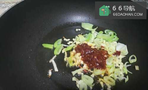 3锅中放油,加入一勺红油豆瓣酱(这种豆瓣酱微辣,我感觉味道很好)加葱姜蒜爆香!