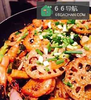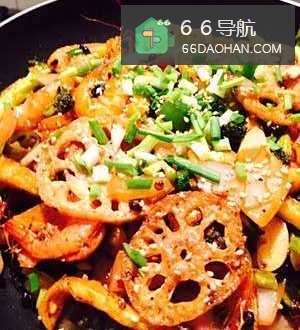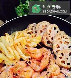 8锅中留底油,放入麻辣香锅料炒扬压香,葱姜蒜辣椒翻炒,下入虾和藕片,薯条,花椒粉,翻炒均匀出锅